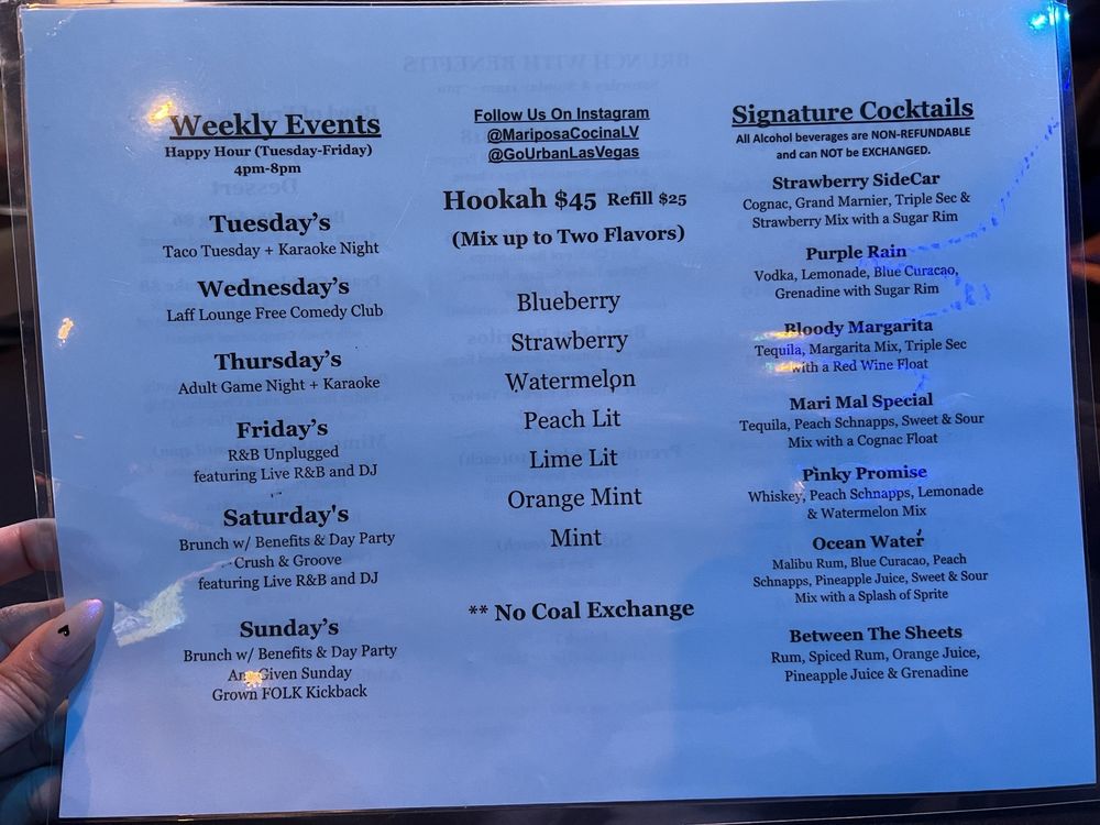 Mariposa Cocina & Cocktails, located in Las Vegas, offers a lively atmosphere with delicious Mexican cuisine and cocktails. The menu features must-try dishes like shrimp and grits, nacho fries with chicken, and chicken and waffles. Customers rave about the attentive service, fun events like Adult Recess on Thursdays, and the energetic vibe of the place. With options for happy hour specials, live music, and outdoor seating, Mariposa Cocina & Cocktails is the perfect spot for a fun night out with friends. Whether you're looking for a party vibe or a relaxing dining experience, this venue has something for everyone to enjoy. Visit Mariposa Cocina & Cocktails for an unforgettable dining experience in Las Vegas.